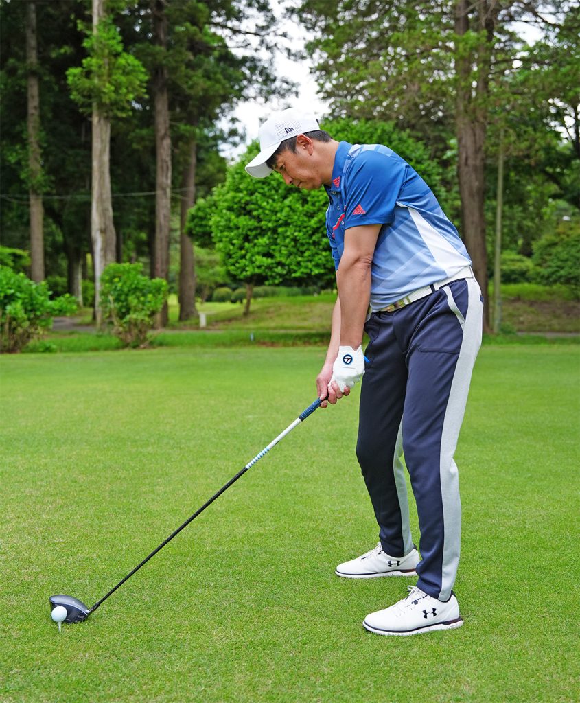 「大型ヘッドの重さを利用して横からバーンッと払うように振っていきましょう。ドライバーもハンドファーストにボールをつぶして打つというのは一つの理想形ではありますが、50歳以上のプレーヤーには向いていません。また、レッスンをしていると弾道の高さを出すために下からカチ上げるように打つアマチュアの人も多くいます。若い頃、小さくて反発力の低いヘッドでスウィングを覚えた名残もあるかもしれませんが、現代のヘッドでは不要の打ち方です。払うように打つというと、フェースを開閉せず軌道も直線的になる人がいますが、あくまでも入射角を緩やかにするだけ。ヘッドの動きをイメージしにくい場合はグリップエンドの先が左ももに向くように振ると、フェースローテーションしながらもヘッドを緩やかに下ろすことができます」