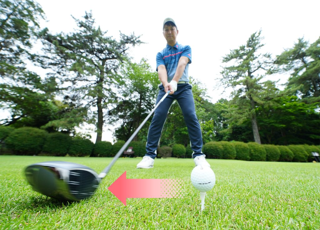 スウィングの中でも、動きだしが最も手に力が入りやすい。そのためすぐにヘッドを上げるのではなく、ヘッドが右足の前を通過するまでは芝の上を滑らせるように動かす