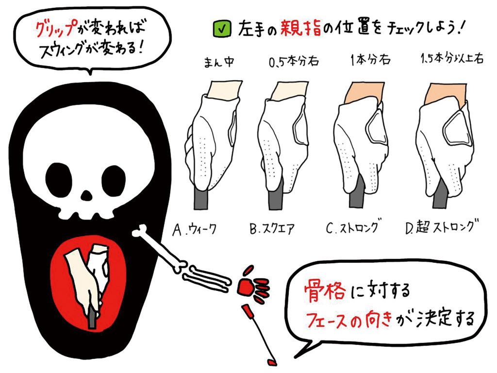 目安は、左手の親指の位置です。下のイラストのように、グリップは4つに分けることができます。左手の親指がグリップの真ん中に位置するのがウィークグリップ(A)、指0.5本分右に置けばスクエアグリップ(B)、指1本分以上右に置けばストロンググリップ(C)、指1.5本分以上右なら超ストロング(D)です。