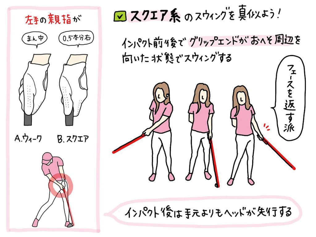 フェースは返したほうがいいか、それとも返さないほうがいいかは「グリップによって違う」とプロゴルファー・大谷奈千代。イラストを交えて詳しく解説してもらおう!