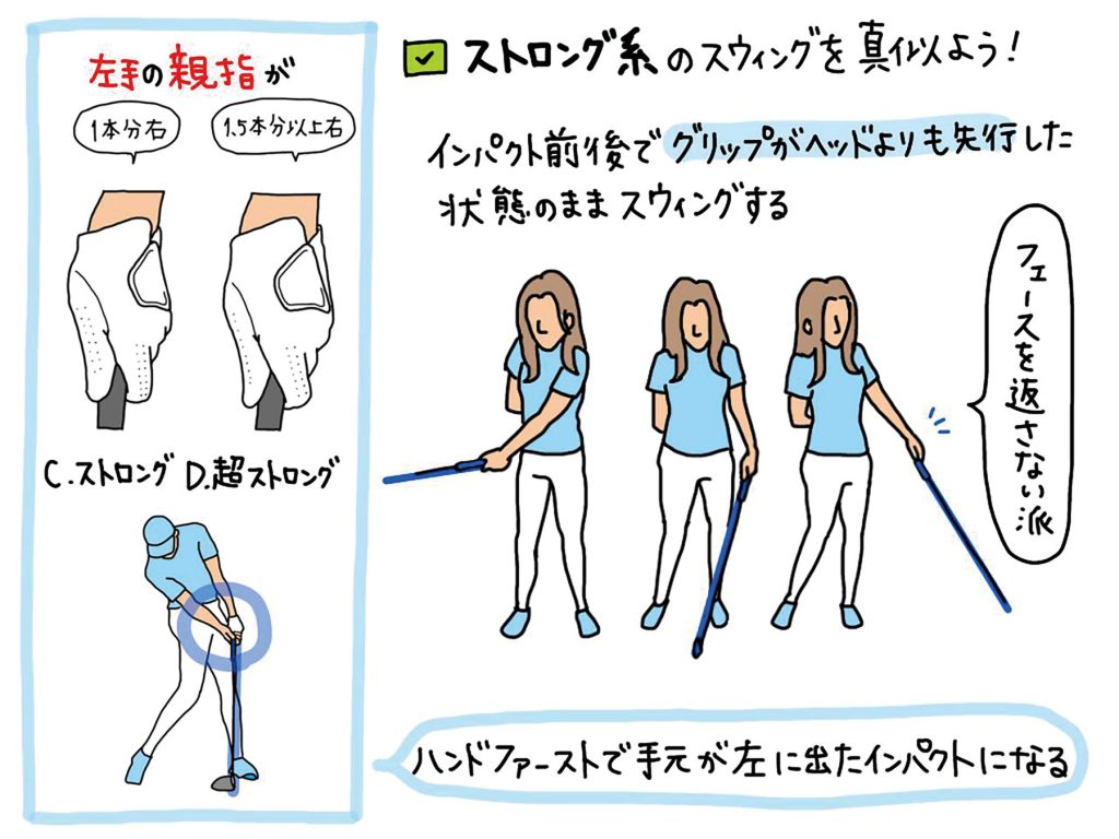 またストロング系の人が、フェースを返す人の真似を練習してしまうと、左に引っかかって大きく曲がってしまいます。スクエアグリップとストロンググリップでは体の使い方が正反対なのです。こういったことから、グリップが変わればスウィングが変わることをしっかり覚えておくことが大切です。