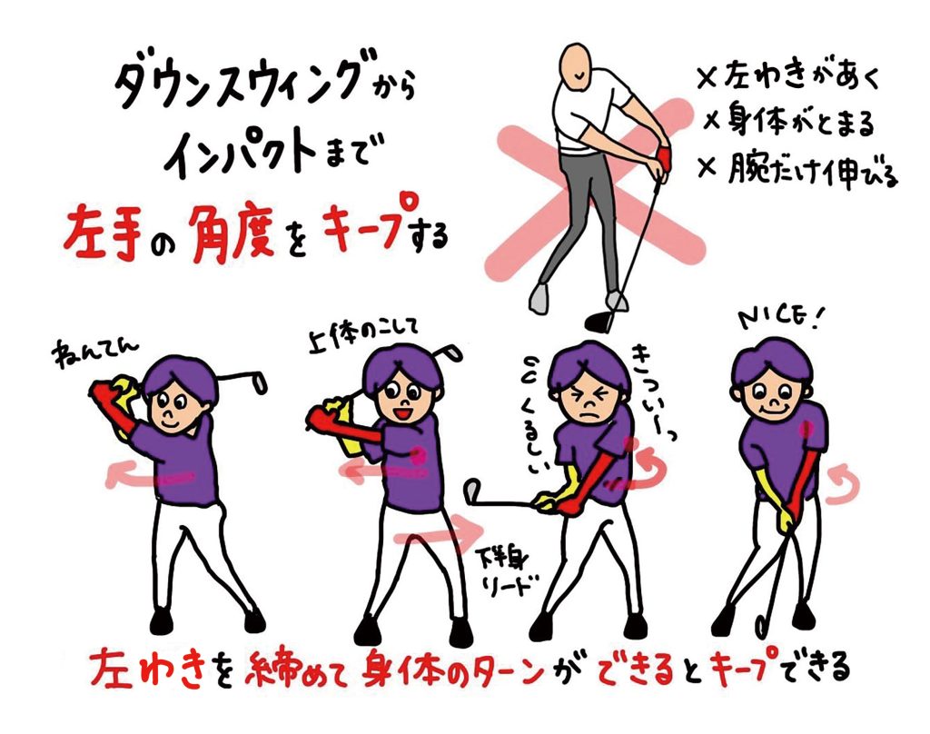 ダウンスウィングからインパクトまで、左手の角度をキープすることがポイント。左わきが開くとスウィングの軌道がズレてしまうため、しっかり締めることを意識しよう