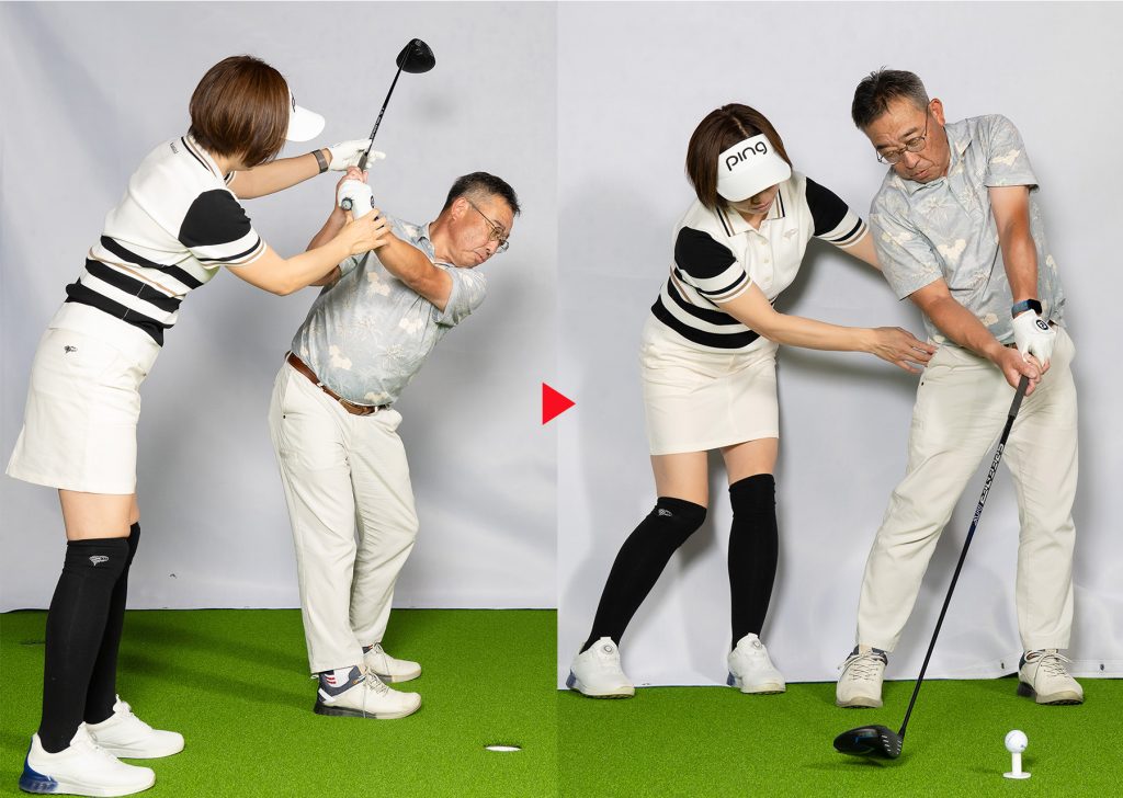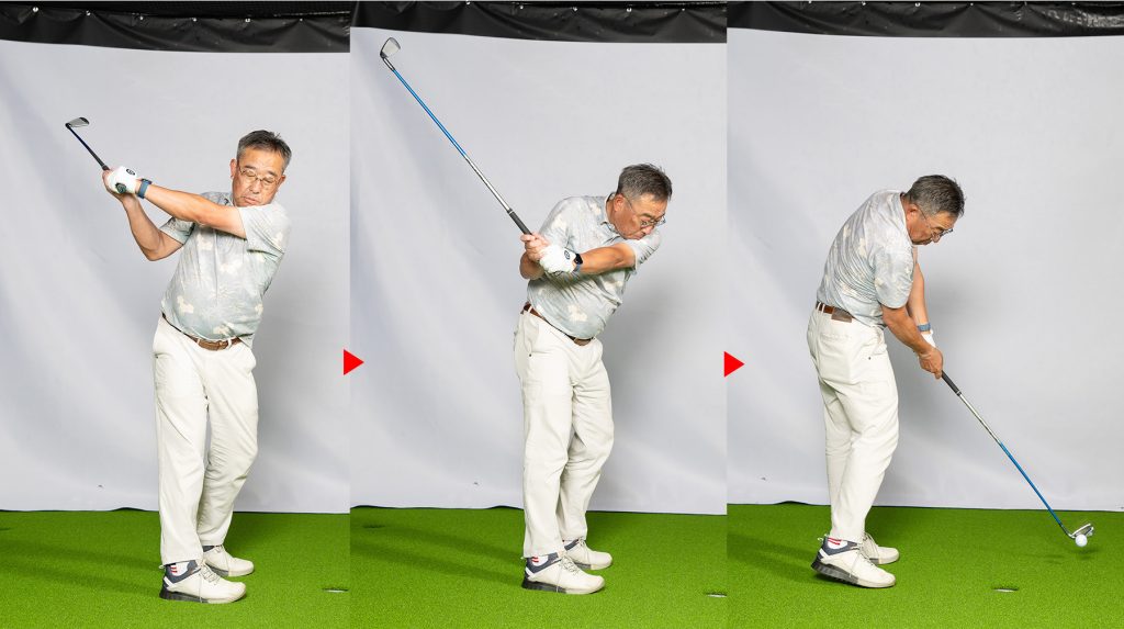 上体を起こしながらダウンスウィングすると、過度なイン‐アウトになりがち。逆に、切り返し後に前傾を深め、腰の前の空間を広くすると、手元を左に振れるのでイン‐アウト軌道をゆるやかにできる。直立状態から前傾して打つドリルで、この感覚を養える