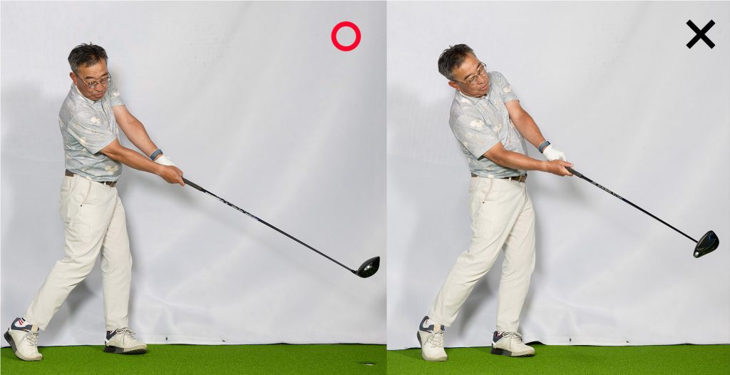 大きく上げようとして、シャフトが飛球線とクロスしている(写真左)。そこから上体を起こし、クラブを寝かせることでイン‐アウト軌道を作っている