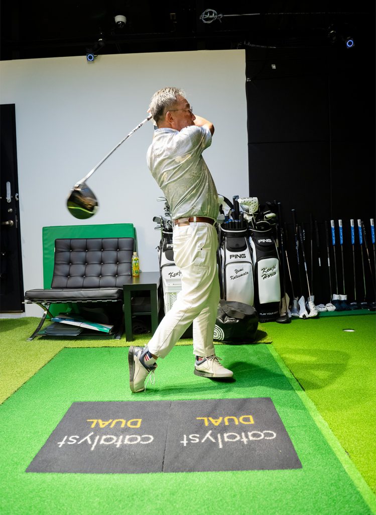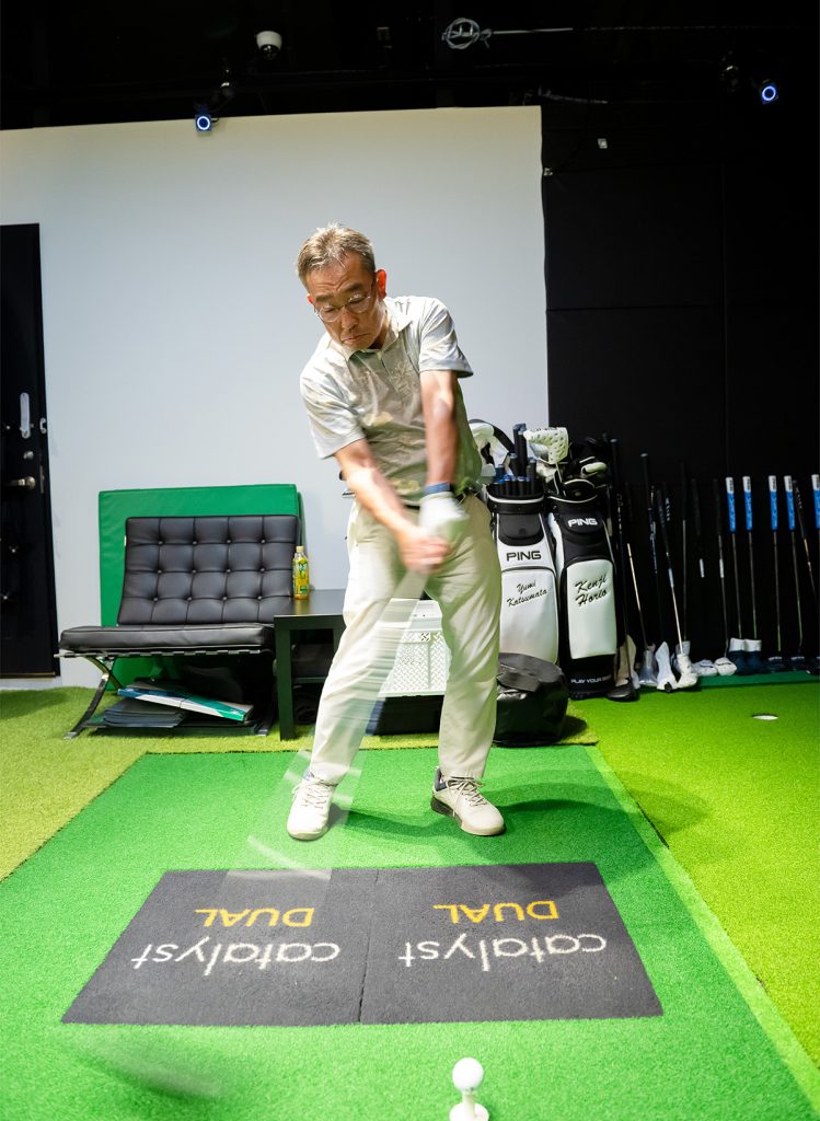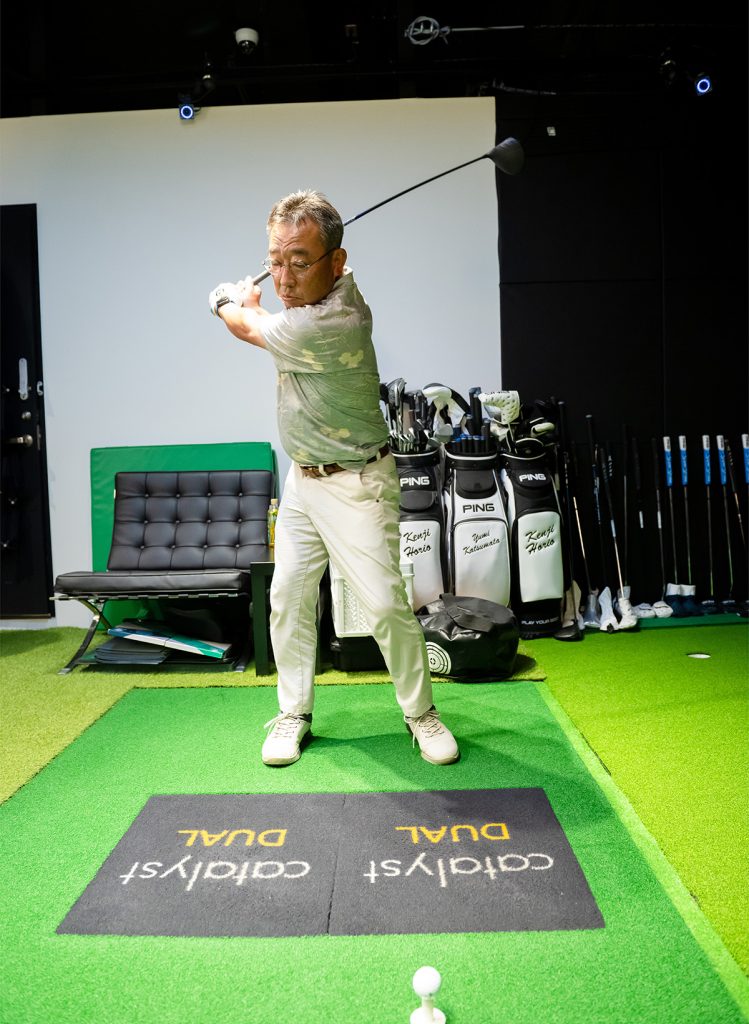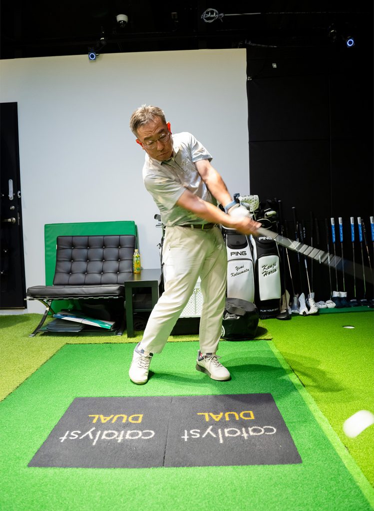 今まで、アウトサイドにクラブを放り投げるようなアッパースウィングだったので、手と体がばらばらでしたが、前傾を意識したら手と体が一体になって動く感覚になりました。