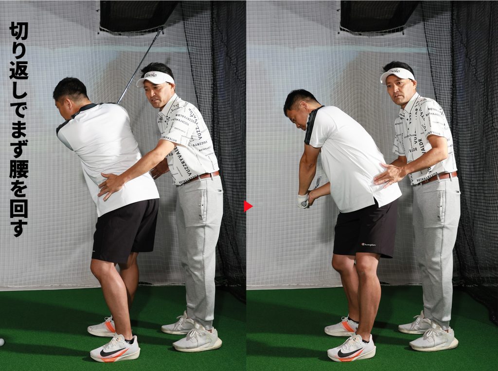 切り返しで腰、肩より先に手(腕)を動かすと、クラブが前に出てカット軌道になる。また、リリースが早まり、インパクトでフェースがかぶる