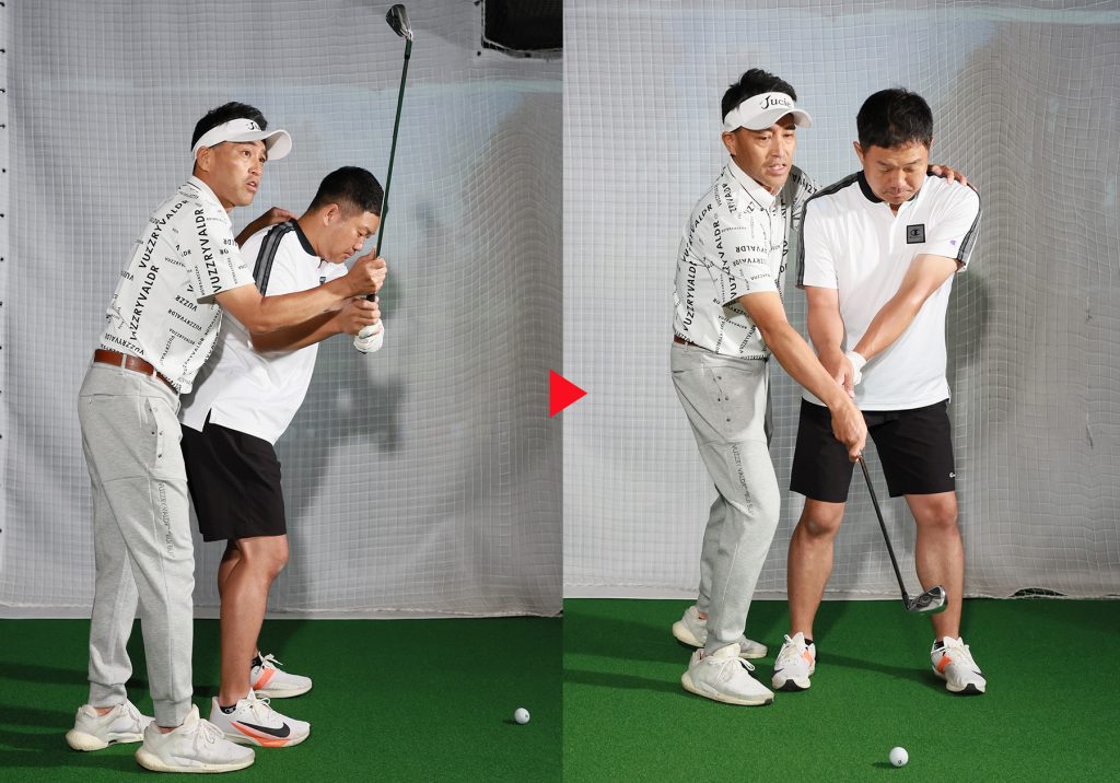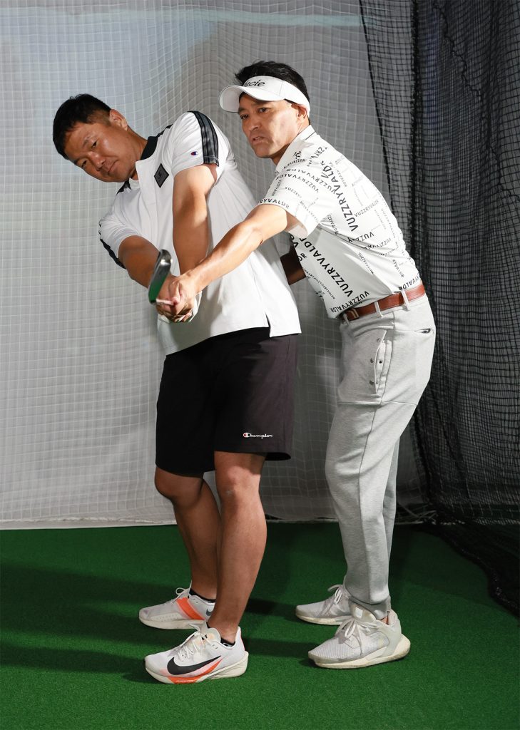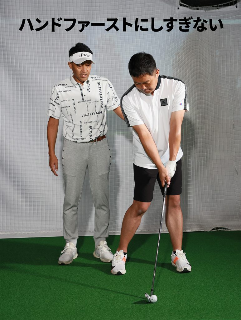 内海 腰、肩が止まってしまっているのが、振り子の動きが強く出てしまう原因のひとつですので、切り返しでしっかり腰から先行回転させてやると、それだけで左のミスは減ります。もっと確実に減らすには、スウィングの中でインパクトポジションをしっかり確立させることが必要です。アドレスと、インパクトの形を何度か反復して、最後に振りかぶって打つドリルを繰り返すと、インパクトの形が整ってきます。