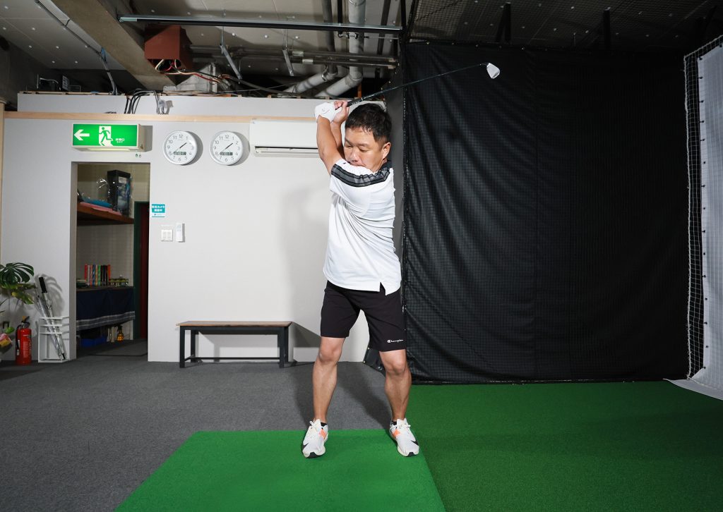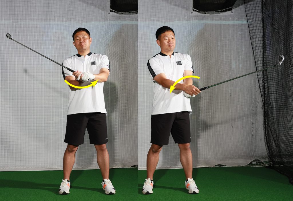切り返しで手が前に出ると、その部分ではクラブが「左回転」している。胸の前で「右回転」を繰り返すと、このイメージを消せる
