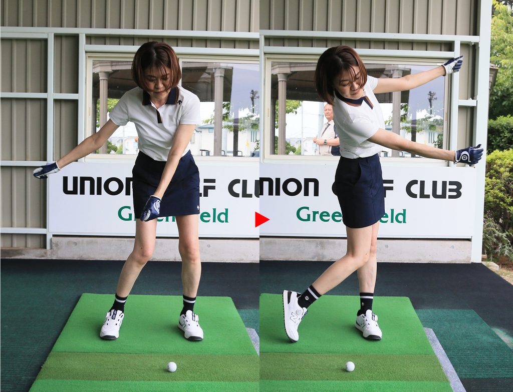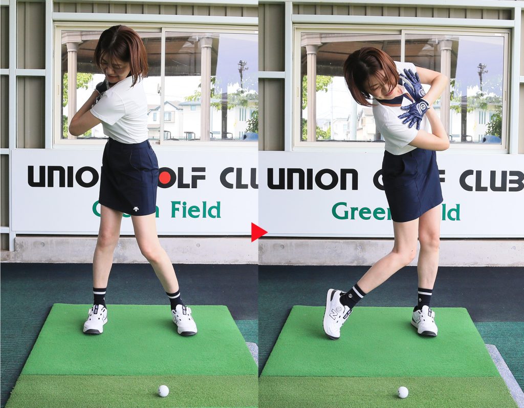 クラブ(あるいはボールかご)を放り投げるというイメージは、すごくわかりやすかったです。体が左に突っ込まなくなると、しっかりヘッドがボールに届くようになりました。