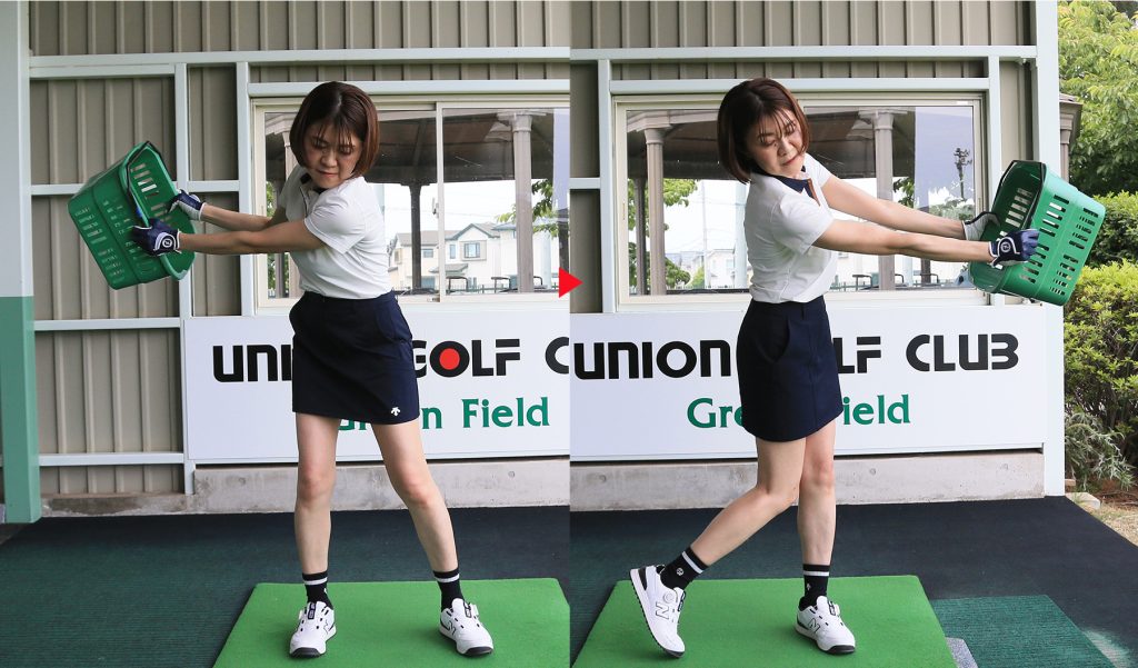 クラブを目標方向に放り投げると、カウンター動作で体は逆に突っ込まなくなる。練習場で実際にクラブを投げるわけにはいかないので、ボールかごを両手で持ち、放り投げるようなイメージで振ると、体を残す感覚がつかめる