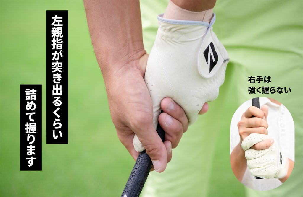 右手の力みがミス動作につながることが多いため右手は添えるだけ。両手を詰めて握って左手1本で振る感覚を重視している