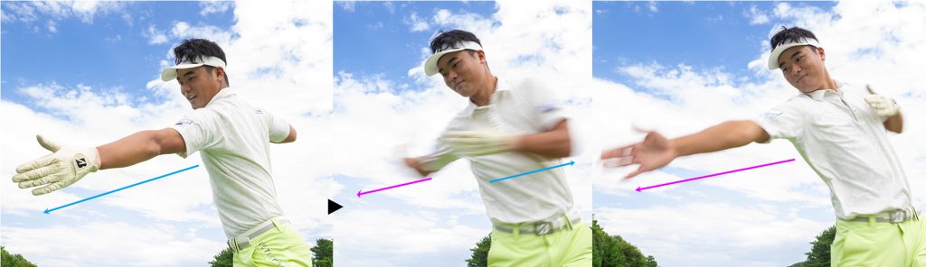 ダウンスウィングで左足に加重させたものを右足側に戻しながらインパクトすることで、左右の動きが拮抗して反作用が働きヘッドが加速する