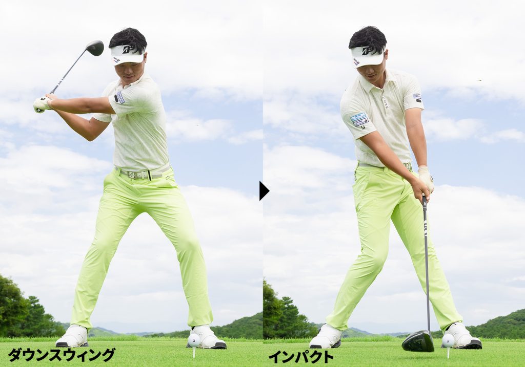 内山 右足の上で回転して振り抜いている感覚は持っています。このとき気を付けてほしいのは、体は回転しますが左肩を上に引き上げるようにタテに動かす感覚を持つといいですね。そうすると、インパクトで体が開かずスライスしにくくなります。このインパクト直前で右足に体重を移す動きと、肩のタテ回転をマスターすれば、打ち出しの高い高弾道のストレートフェードでブッ飛ばせること間違いありませんよ!
