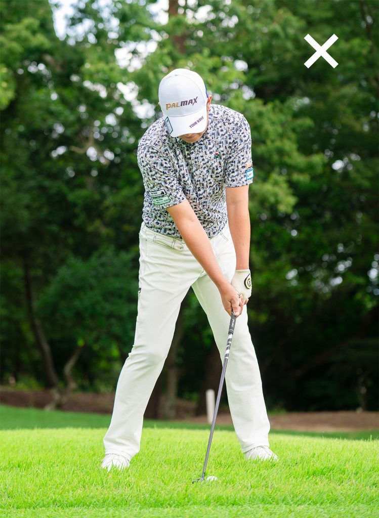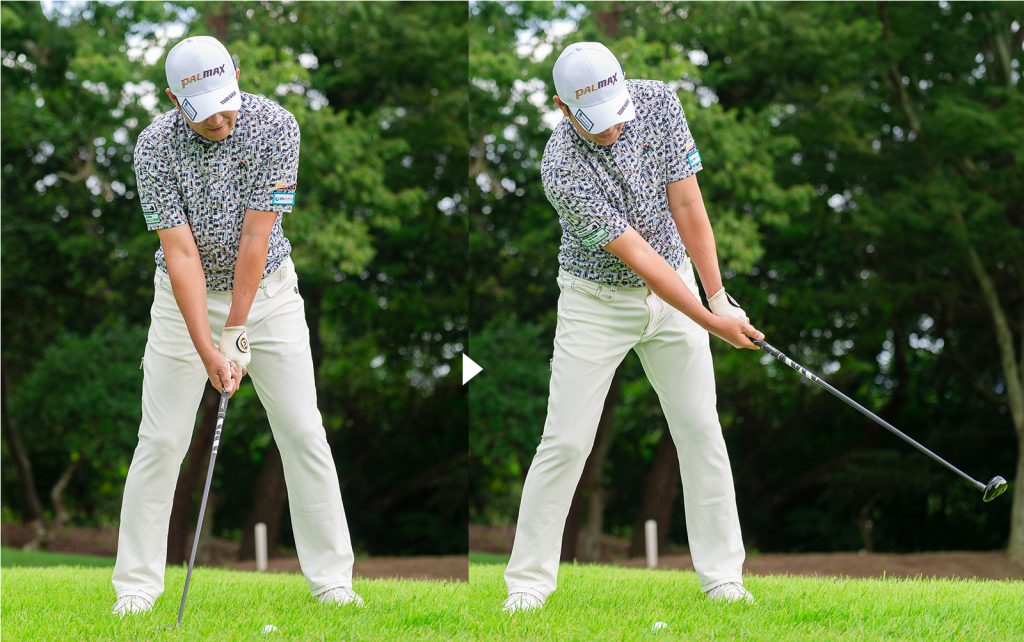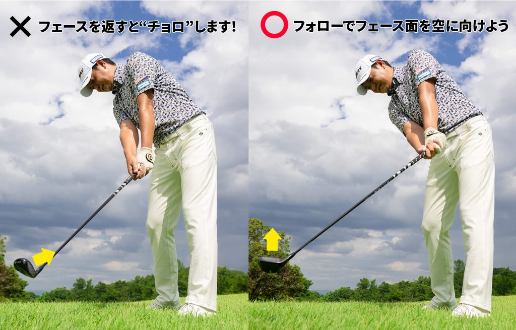 芝を刈り取るようにカット気味に振るため、フォローはインサイドに振り抜く。飛ばしたい気持ちが大きいとフォローが大きくなりがちだが、低くコンパクトに振り抜くのがポイント