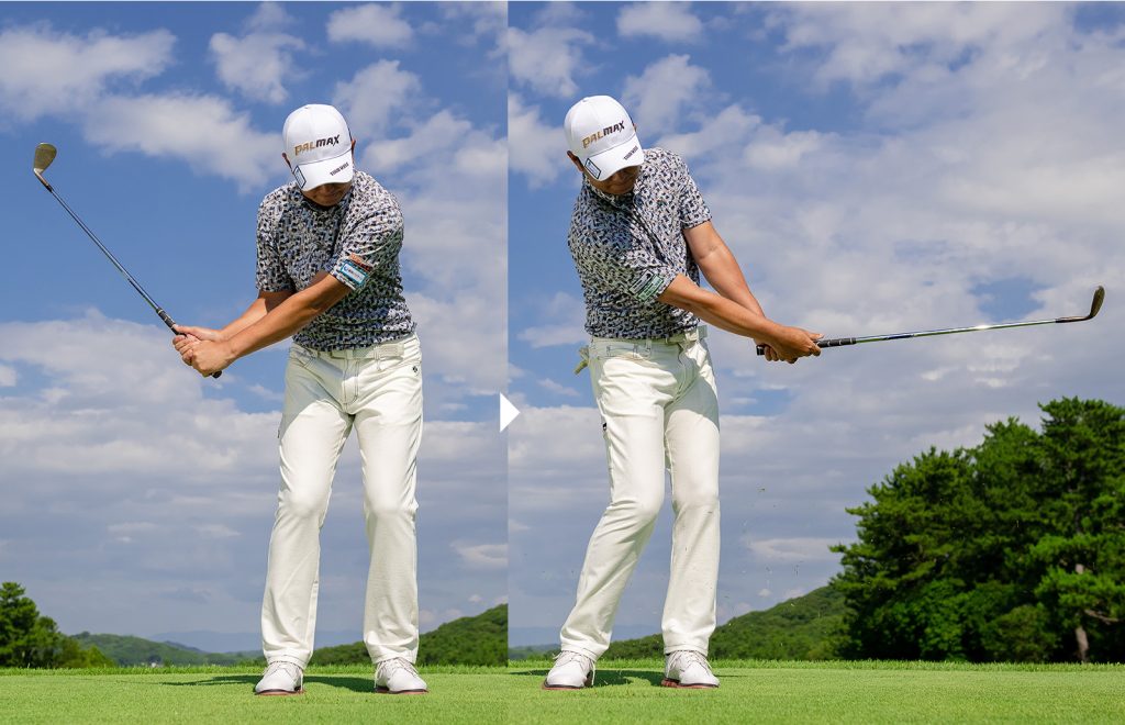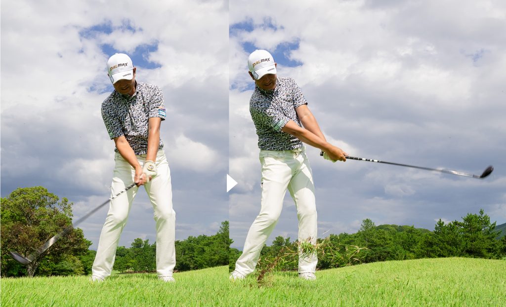 フォローでフェースを上へ向けるには、右手のひらを上に向けるように使う。そうすると、UTのソール面全体を使って芝を押し倒しながら振り抜きやすいという