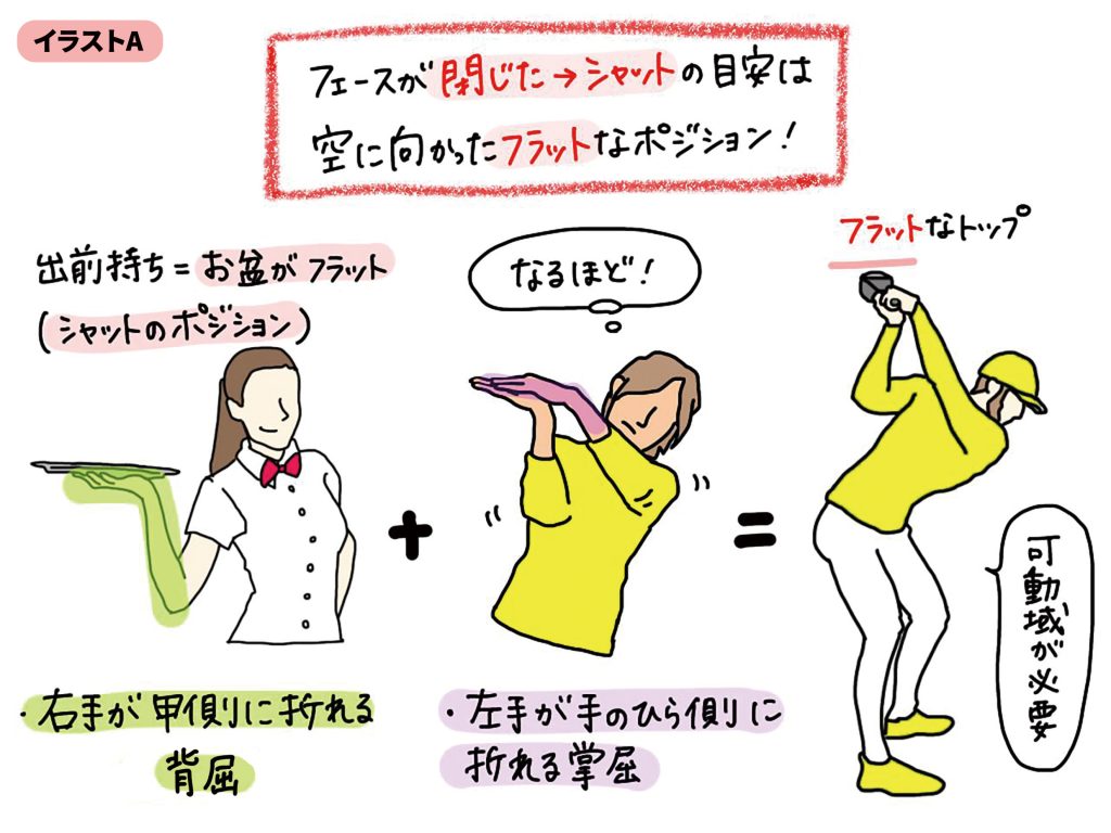 もし、右わきが空いた状態で右ひじが外向きになってしまうと、右手首を甲側に折ることができずにアドレスのときのままの角度でクラブを持ち上げることになってしまいます。こうなると、体の回転に腕が逆らう結果になるので、軸回転運動ができなくなって、手打ちのミスが起こってしまいます。 トップに向かって右手首を甲側に折る際は、右ひじを下に向けて動くことがセットということを覚えておきましょう! イラストAのように、フェースが閉じた状態=シャットの目安は、フェース面が空に向かったフラットなポジションです。