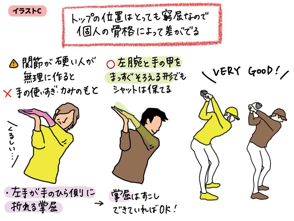 しかし、関節が硬い人が無理に作り込んでしまうと、手首の使いすぎや力みの原因になってしまうので注意が必要です。そんな方は、イラストCのように左腕と左手の甲を真っすぐに揃える形にして上げるトップを参考にしてください。このポジションでもフェースを閉じた状態のシャットを保つことができるので、フェースローテーションを抑える効果を得ることができますよ!