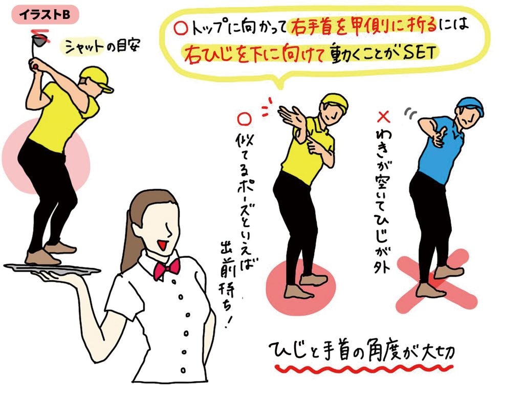 シャットにクラブを上げる=トップに向かって右手首を甲側へ折り曲げるには、右ひじを下に向けて動かすことが大切。そのためには右わきが空いていないことが前提となる
