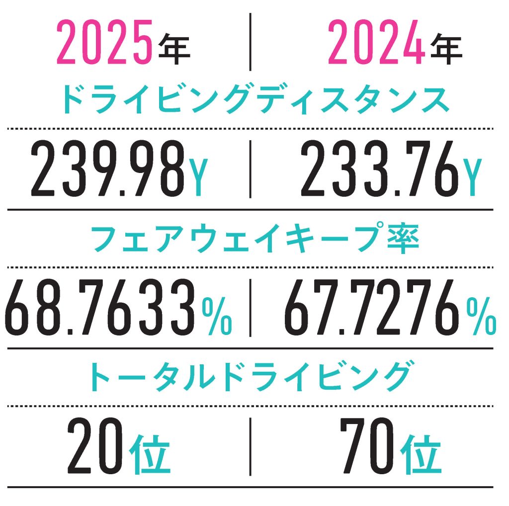 去年より飛距離が伸びただけなく、フェアウェイキープ率も向上したため、飛距離とフェアウェイキープ率の順位を合計したトータルドライビングが大きく向上した