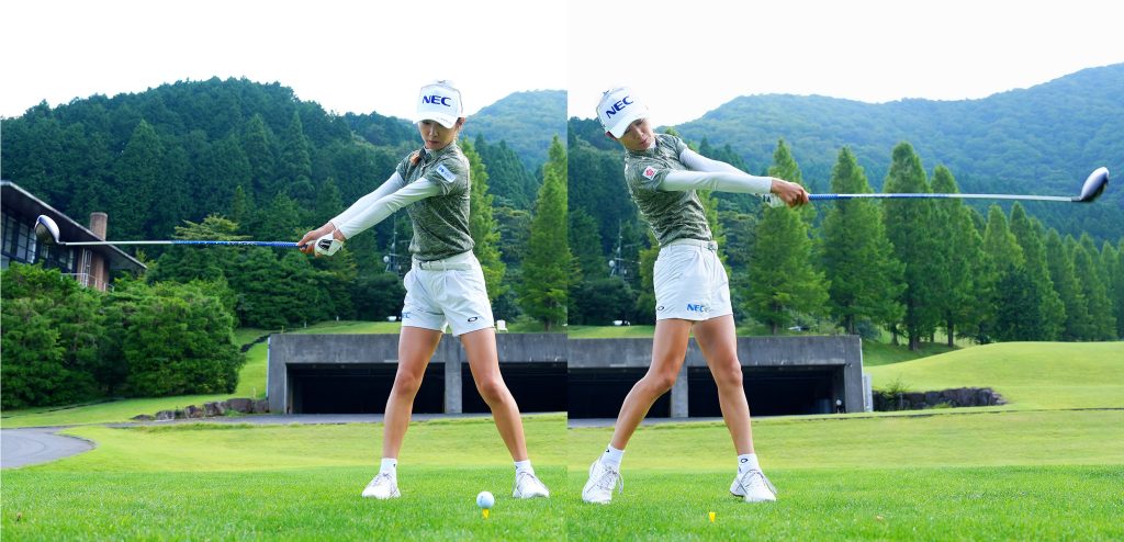 大西 祐香プロの場合、少し手を使って上げるクセがあったので、体全体を使ってクラブを上げる感覚で、低く長くテークバックするようにアドバイスしました。ハーフウェイバックでアークが大きくなってトップでパワーを溜められると、クラブと腕の重さが生み出す遠心力によって、自然にフォローサイドのアークも大きくなるんです。