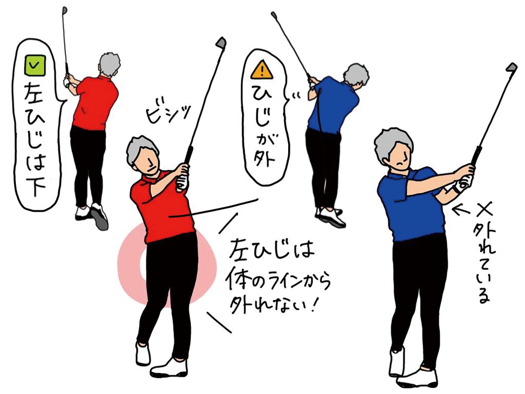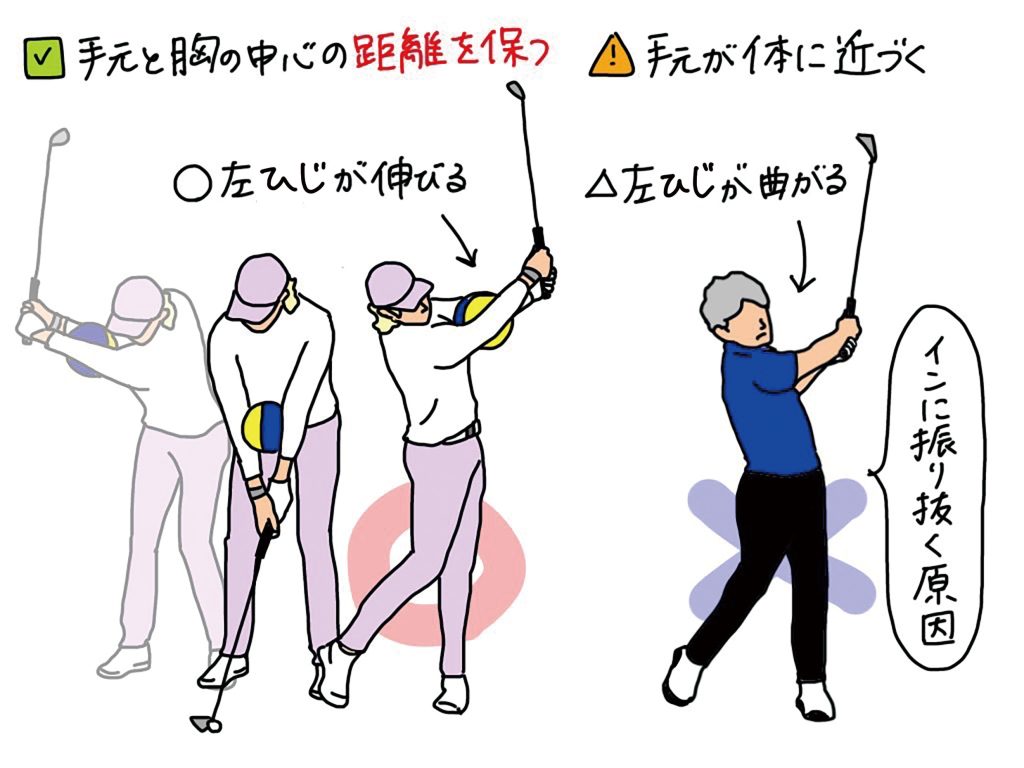 しかし、イラストのようにフォロースルーで体の幅から左ひじが外れてしまっている方は、スライス系のボールが出やすく、縦距離が合わない傾向があります。