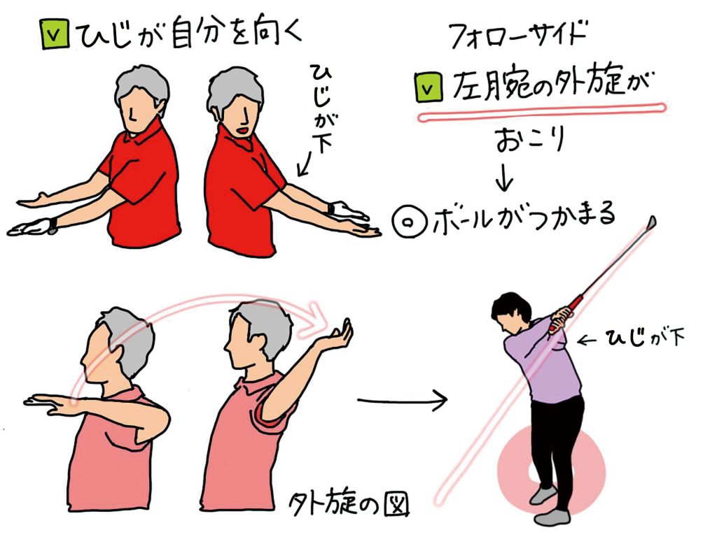 左ひじが引けることなく、左わきが締まった状態で体をターンできれば、フォローサイドでは左腕の外旋が起こり、左ひじが自分の側(実際のスウィングでは下側)を向く