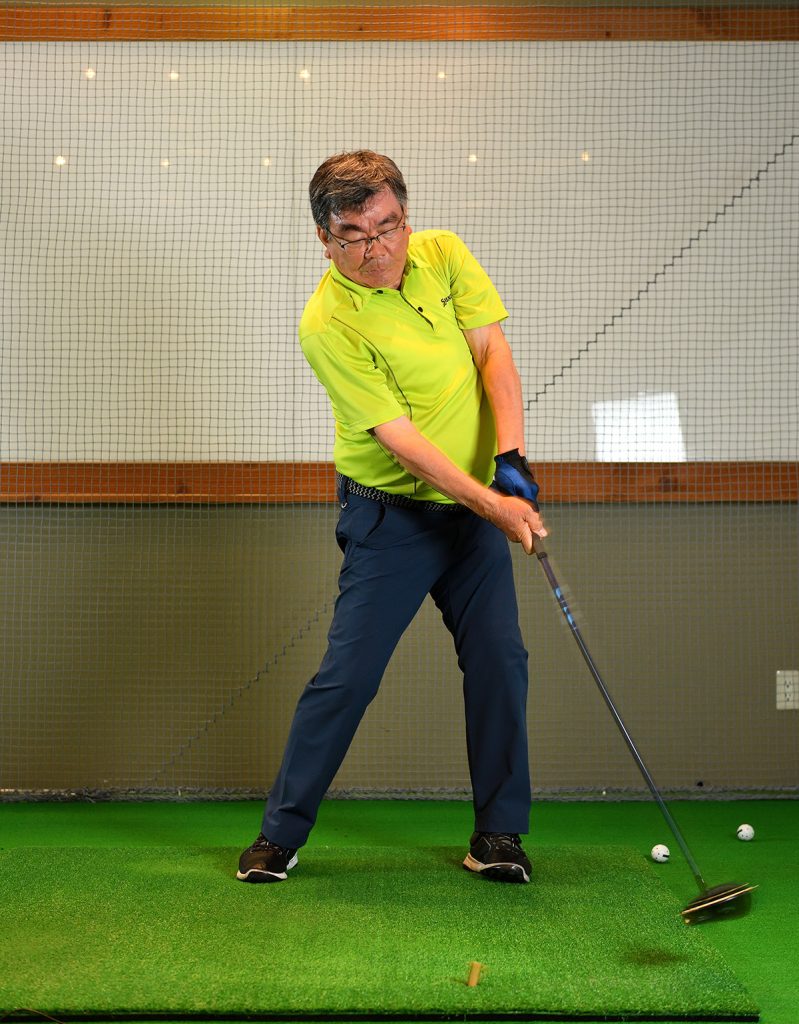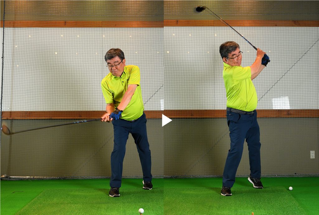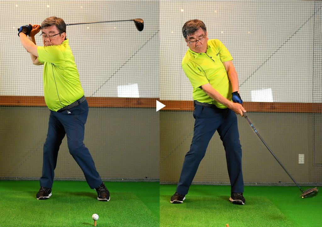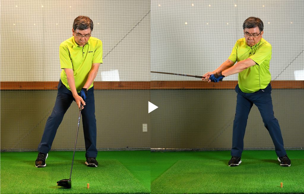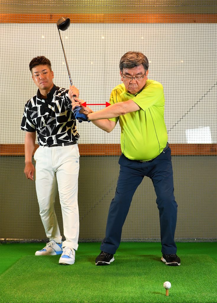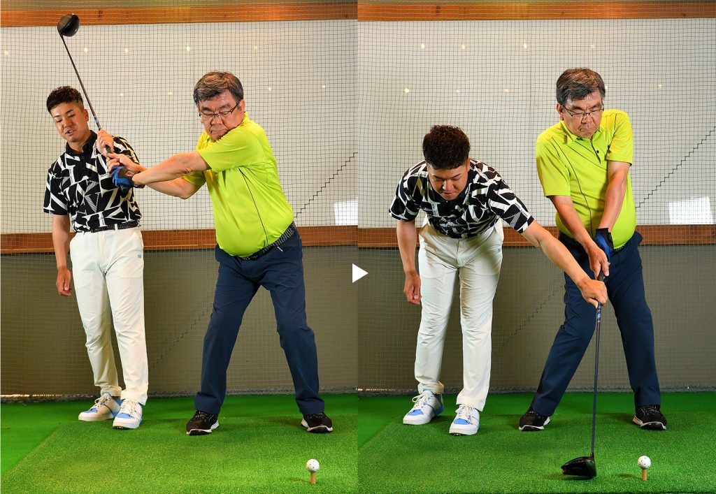 加藤 テークバックは下半身から動いて、手をなるべく遠くに保って上げてください。下ろすときもグリップエンドを飛球線後方に動かす感じで手を体から遠ざけます。円弧が大きくなって、入射角がゆるやかになると思います。