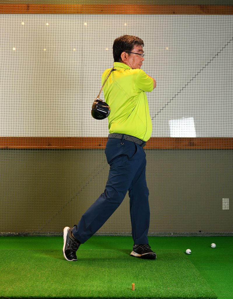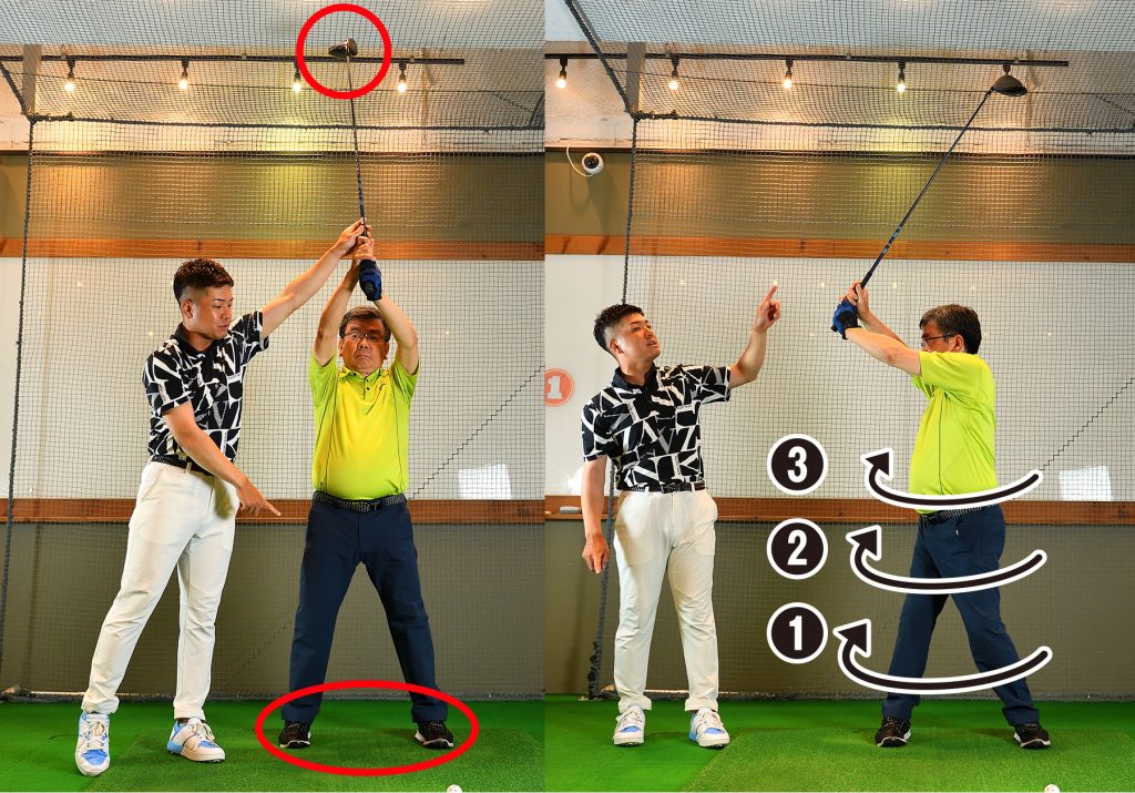 手と体の距離を保ったままだと、手は高く上がらない。トップを大きくするには、下半身、上体を普段以上に回すことが必要。左足をヒールアップすることで、下半身を大きく使う感覚がわかる