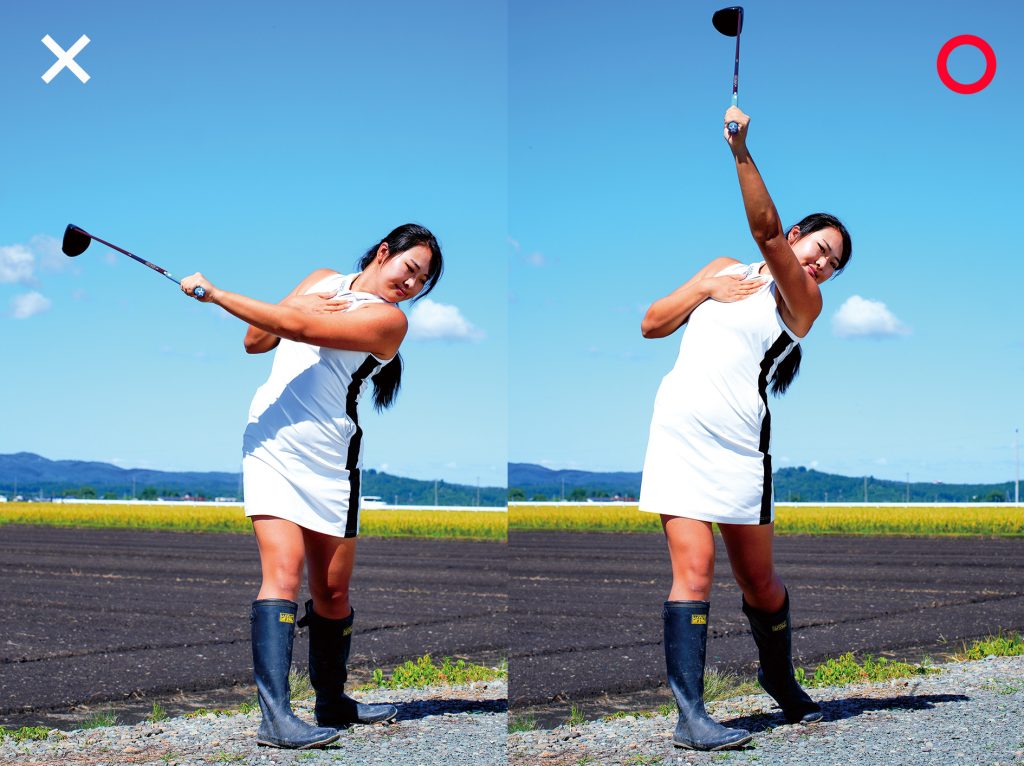 テークバックからトップにかけて、胸を空に向ける意識があるとトップが高くなり大きなスウィングになって飛距離が出しやすくなる
