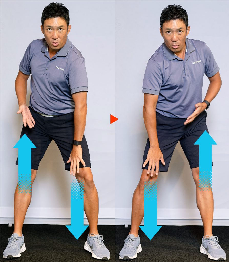 バレルスウィングは、左右の体重移動ではなく体の中で上下のうねりを使う。テークバックで両ひざを外側に踏ん張って下半身をどっしりさせるガニ股のイメージを持つと、上半身でうねる動きが作りやすい