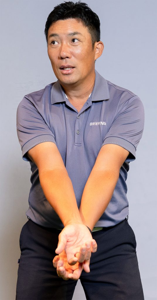 GD 右ひじを体に近くし、左ひじを上側に向けると、インパクトで思い切りフェースが開いてしまうと思うのですが……。