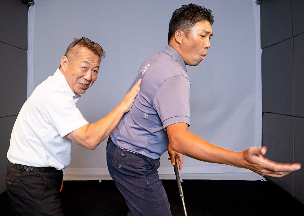 糸山 そう。手とか下半身じゃないんですよ。だから右への体重移動とか、トップを高く上げるという意識は全く必要ありません。体の内側の筋肉を動かしてうねりを発生させるというのはとても良いイメージだと思います。アマチュアの人は普段使っている手にもっとも意識が行きやすいので、背中くらい真逆を意識するとちょうどよいと思います。