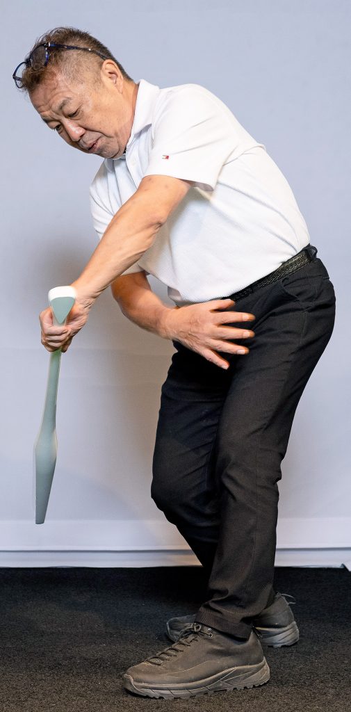 糸山 それは棒立ちの状態で行っているからです。両肩を結んだラインが垂直になるくらい上半身を思い切り倒してみてください。そうすると腰の前にスペースができるはずです。そこに右ひじを持ってくるとフェースはちゃんとスクエアに返ってきます。