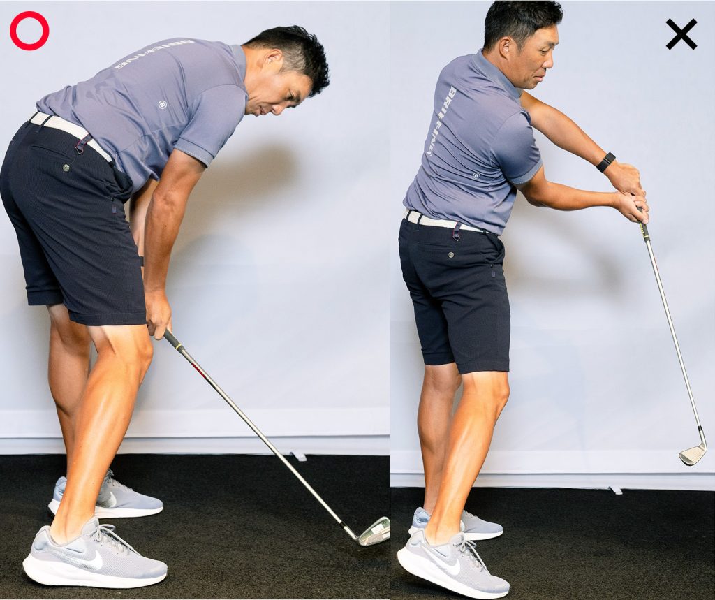 アドレスの際に二の腕が胸の上に乗るようにして構えると、切り返し以降で右腕が動かしやすくなる。わきを締めるような意識で構えてしまうと、切り返しの際に右わきが窮屈になり背中側のうねりを使えない