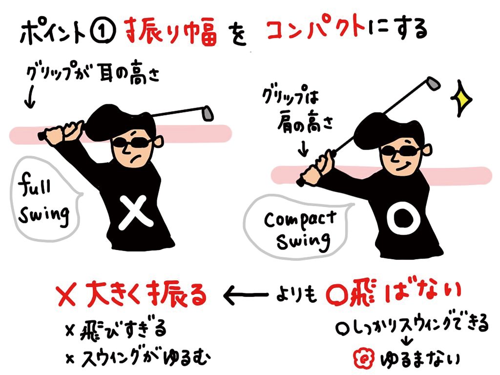 距離に対してバックスウィングが大きすぎると、インパクトに向かってクラブを減速させてしまうため、スウィングに緩みが生じてしまいます。