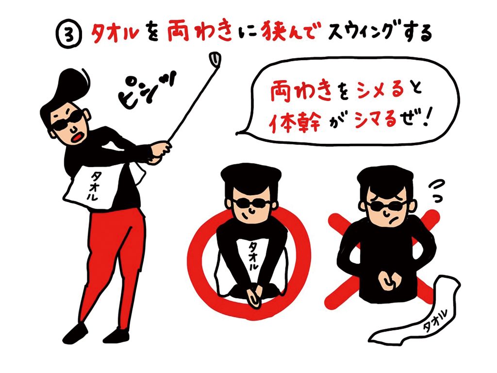 この感覚をなかなかつかめない方は、両わきにタオルを挟んでスウィングすることをお勧めします。両わきを締めることで腹筋に力が入るので、体幹を使いやすくなりますよ!