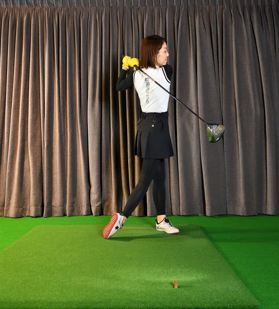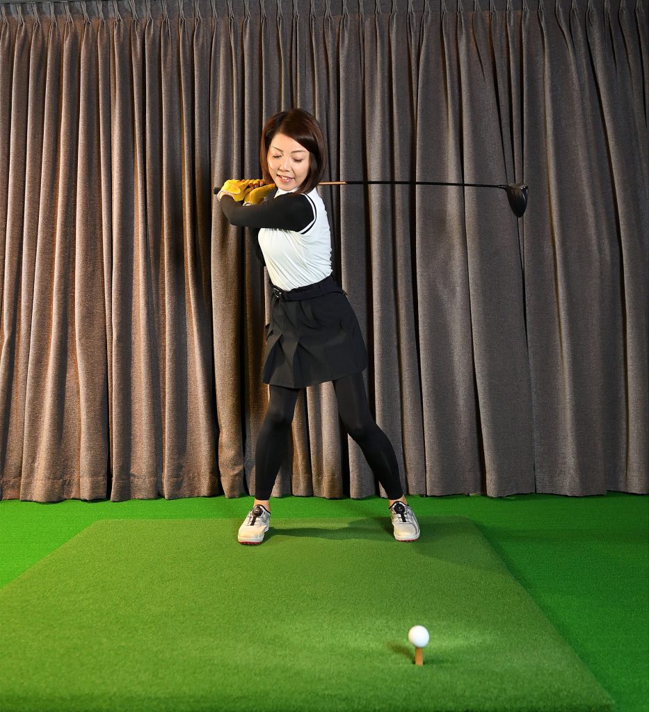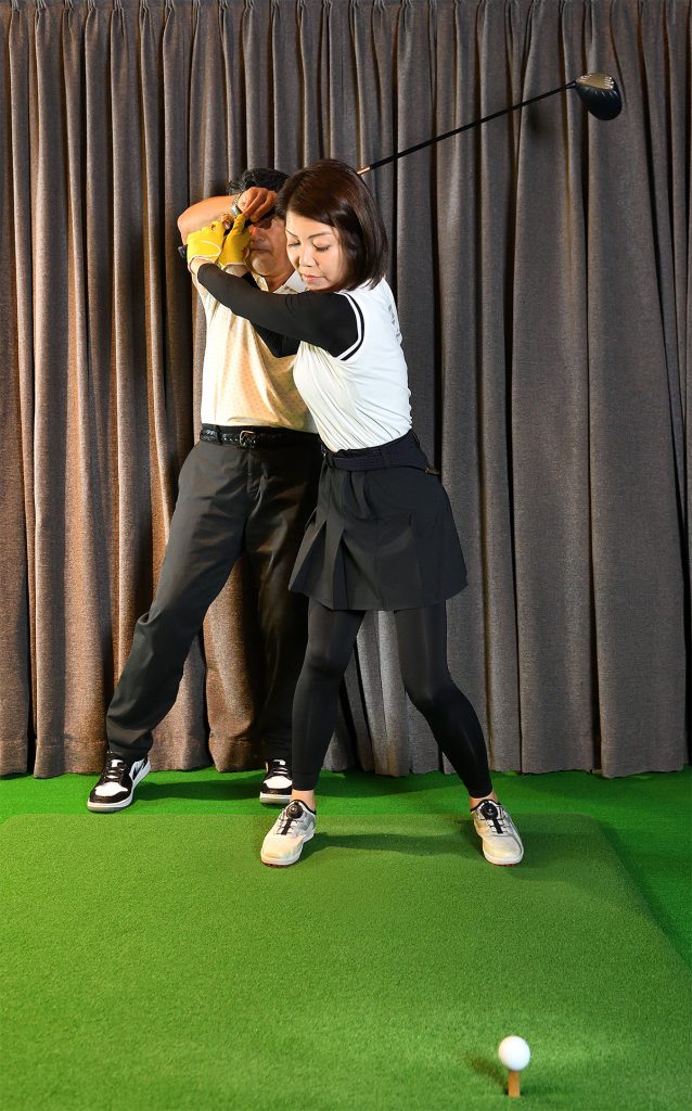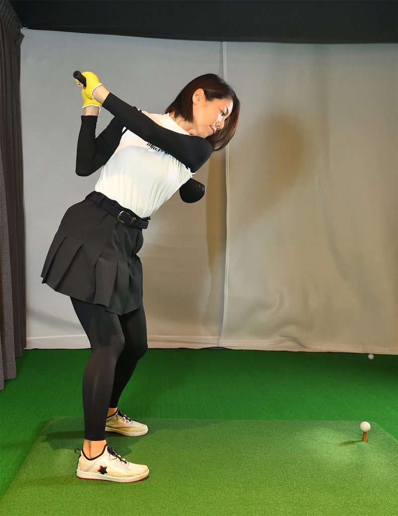 手が体の回転と一体の(手が常に胸の前にある)状態で上げていくと、普段よりトップがコンパクトに収まる。そこからさらに手を上げて、トップを大きくしようとしないこと