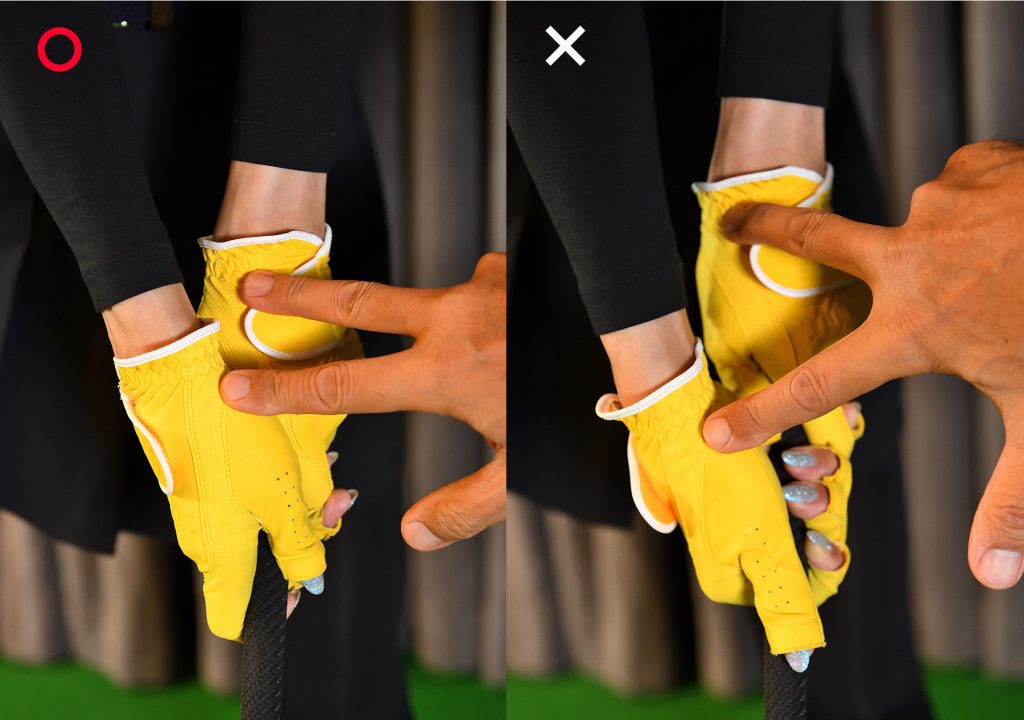 藤井 打点が上下にぶれるということですね。伊藤さんの場合、まず左右のグリップの間隔が広すぎるというのが問題です。だから右手の親指が長く見えますよね? こうなっていると、アドレスで右肩が前に出やすくなりますし、テークバックがスタートしてからも必要以上に手を使ってしまいやすいんです。