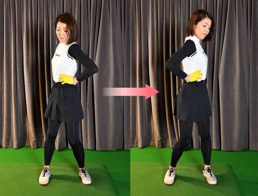 肋骨の一番下の部分を両手で持ち、その部分を左右に回す意識で体を回転させる。実際のスウィングでも、この部分をしっかり回すことで過度に手を使わなくなる