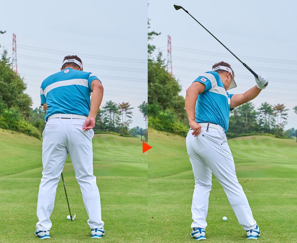 吉田 乗りません。いまのPGAツアーの主流は、むしろ逆の左ウェイトです。そのため、右腰を左後ろ方向に回しながら、テークバックしていきます。