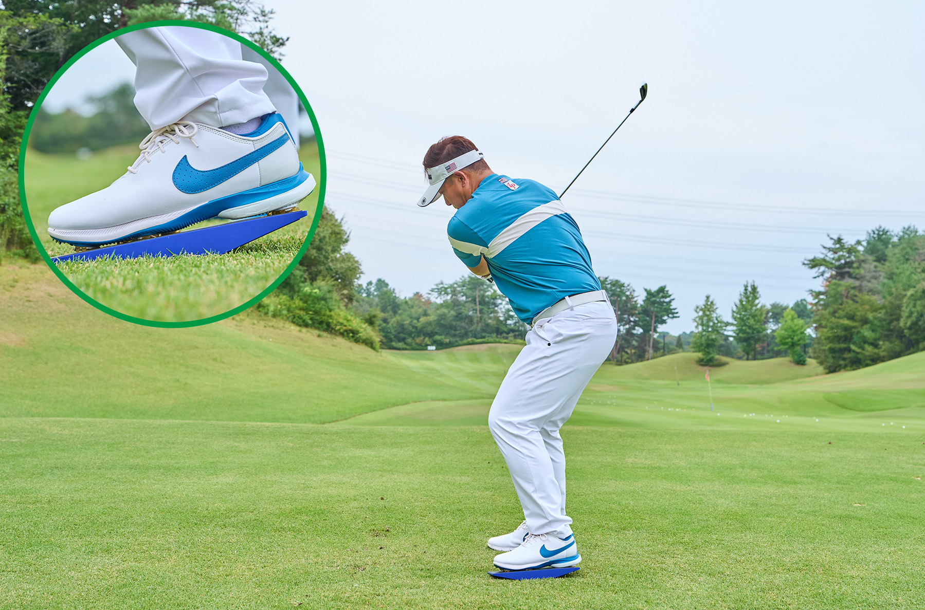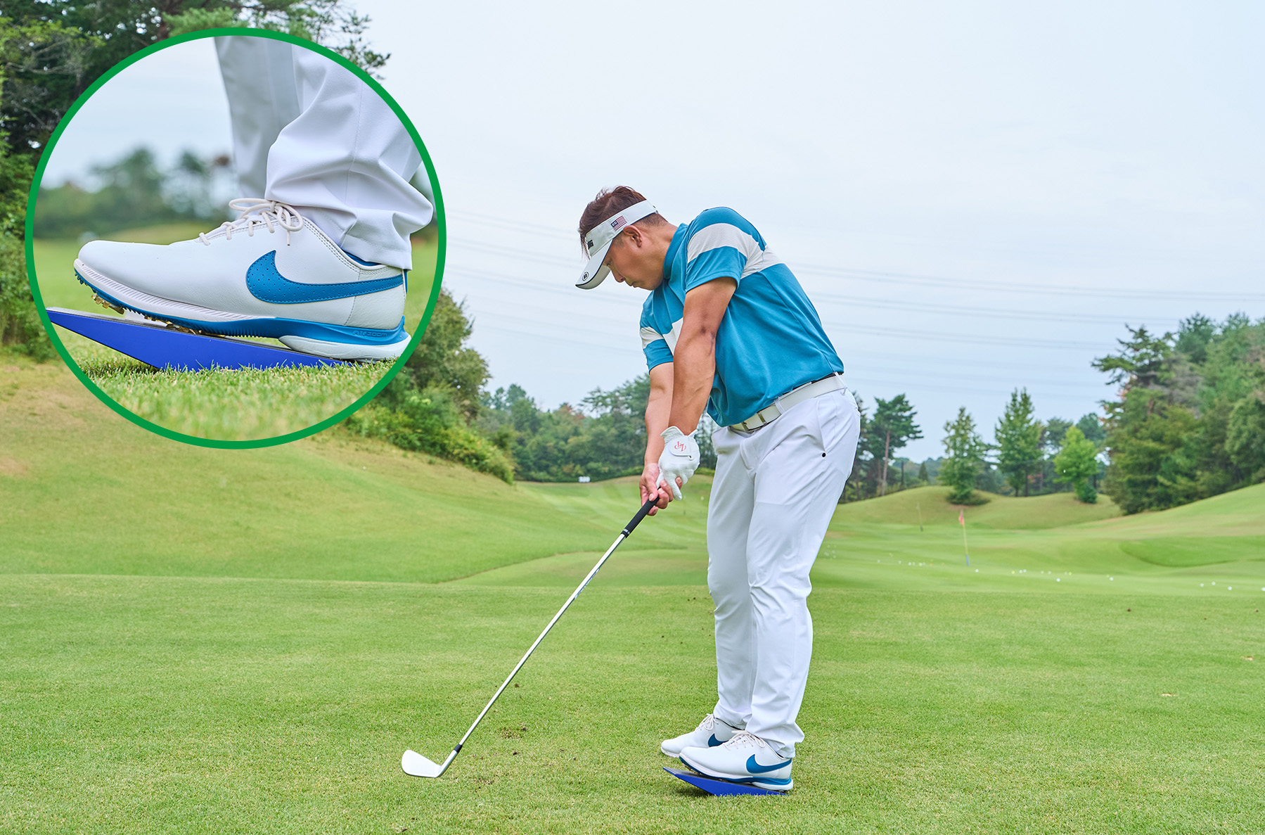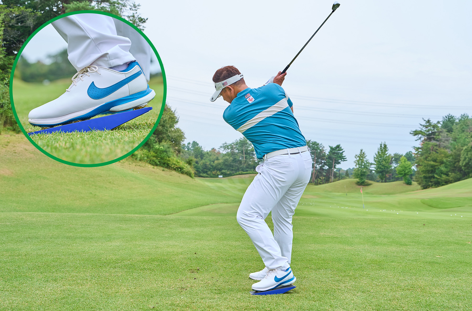 「パワーシフトプラスを裏向きに置いて、左足で踏みます。アドレスでかかと、トップでつま先、切り返しでつま先、インパクトでかかとを踏むように素振りします」
