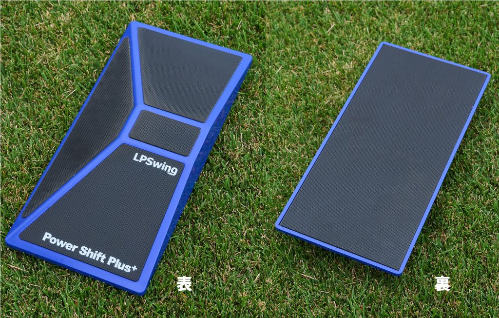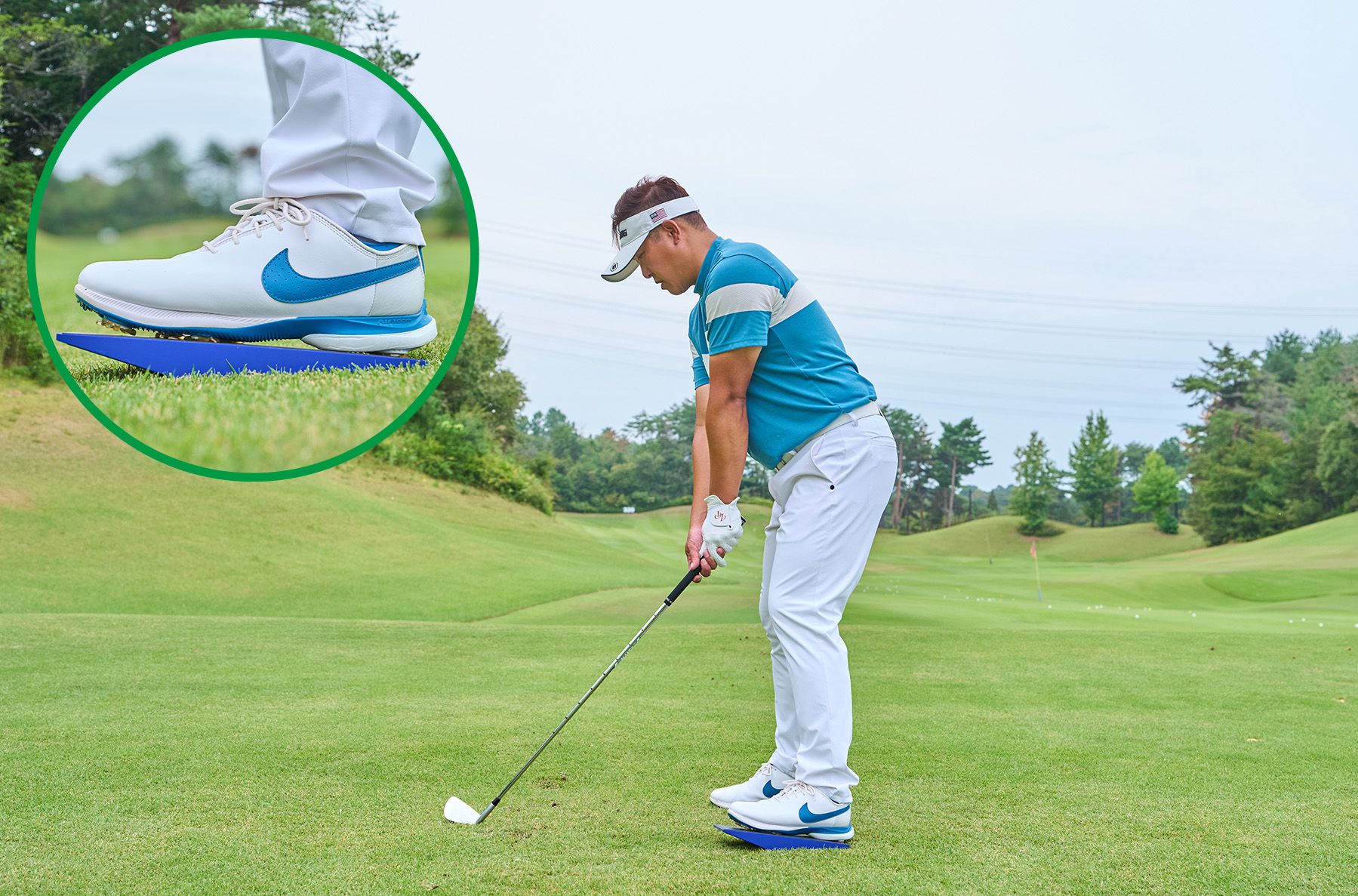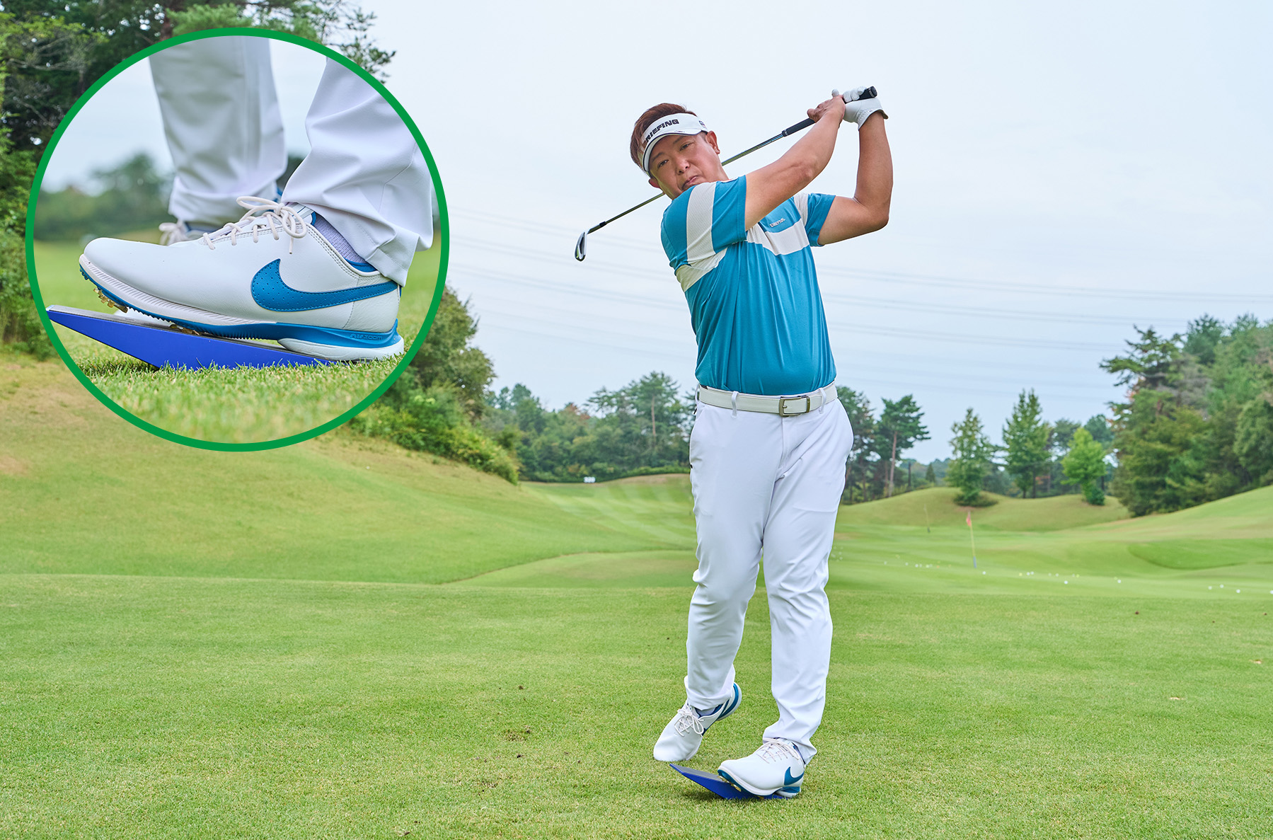 「パワーシフトプラスを裏向きに置いて、左足で踏みます。アドレスでかかと、トップでつま先、切り返しでつま先、インパクトでかかとを踏むように素振りします」