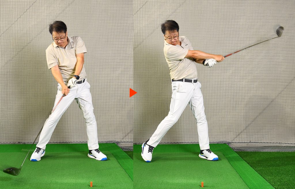 インパクトを境に、右手が左手を追い越すように動くことでフォロー側のヘッドの運動量が増加する。いつまでも左手を振り続けてしまうと、右手が左手を追い越せずヘッドスピードは上がらない