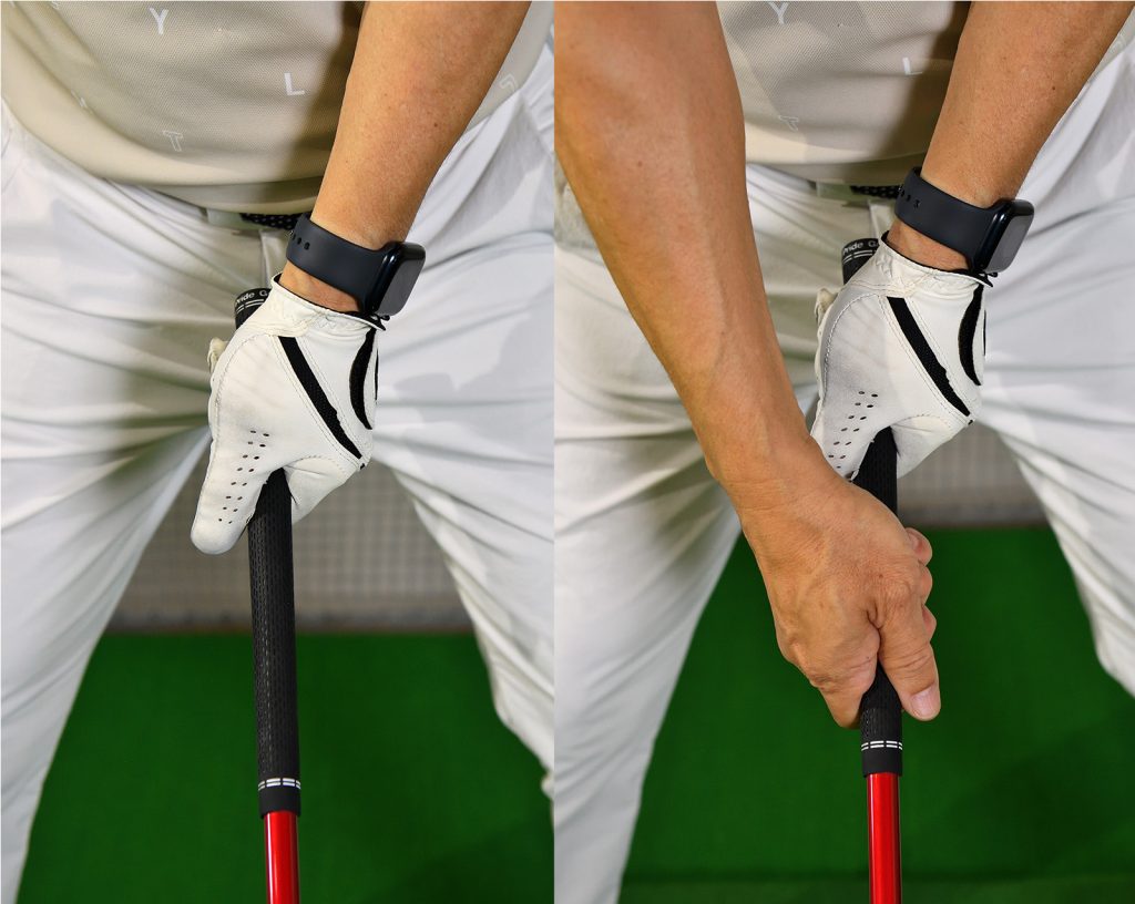 左手のグリップを必要以上に強く握っていると、右手のリリース動作を阻害してしまう。とくに小指側の3本は、必要最小限の力で握るように意識すると、右手が左手を追い越す動きをアシストできる