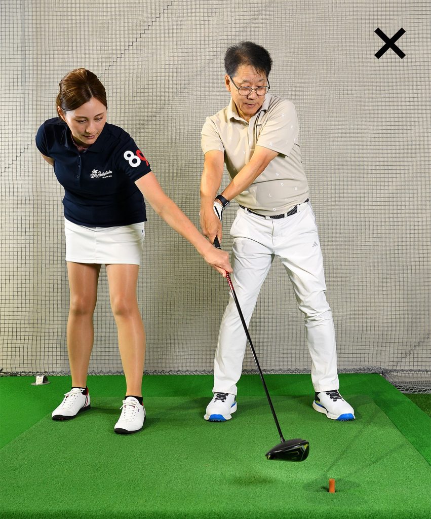 吉本 右手と左手がケンカして、右手のリリースを左手がブロックしているような感じですね。左手の親指をグリップの横に外して、右手は左手から少し離して握った状態で振ると、左手がリリースを邪魔しない感覚がわかると思います。