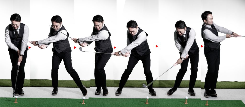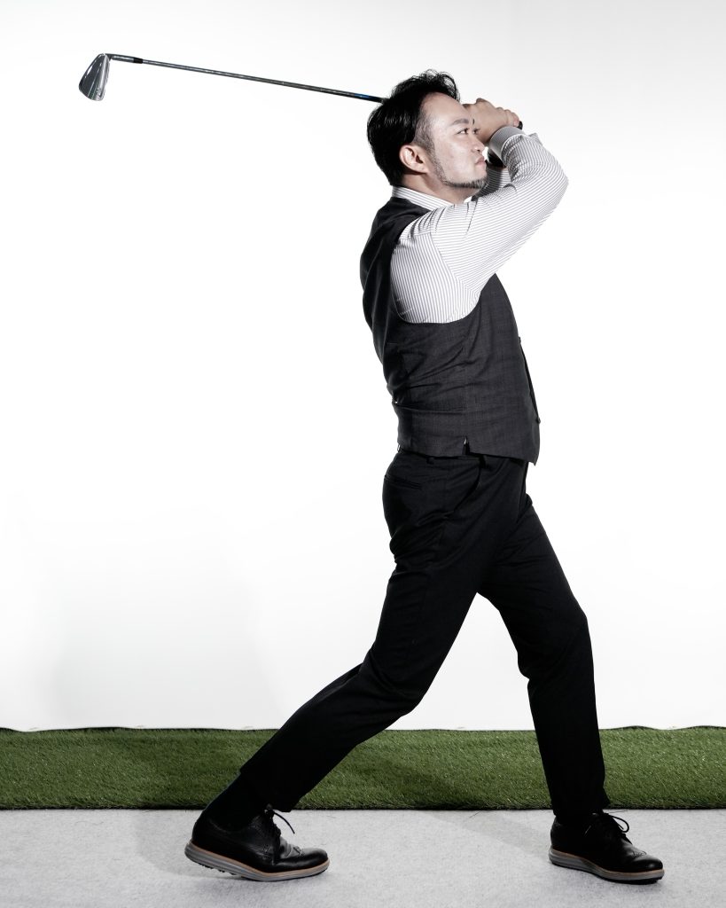 両足をそろえてボール前に立ち、そこから右足を踏み出しながらバックスウィング。踏み出した右足に左足も寄せていくと、体は大きくボールから遠ざかります。今度は左足をボール位置より先まで踏み込んで、そこに右足を寄せながらボールを打ちます。打ち終わったら両足がそろってピタッと止まっているのが理想。腕を振ることは考えず、体のスライドだけに意識を集中してください。