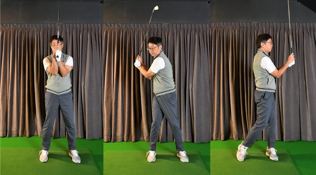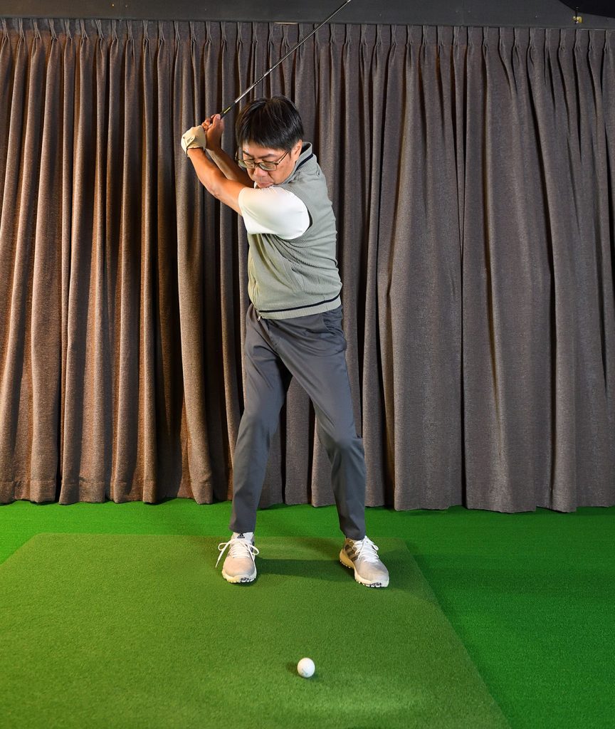 切り返しで右手首が支点になって(右手首がいきなりほどけて)しまうと、上半身と下半身の時間差が作れない。右手首の角度を保ちつつ、右肩を後ろに残して切り返す意識を持つといい