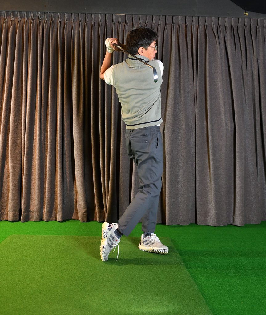 ダウンスウィングに入ったら、左骨盤(あるいは左の尻)を後ろに引くイメージで回し、最終的に左足かかとに重心がかかるようにフィニッシュまでもっていくとスムーズに回れる