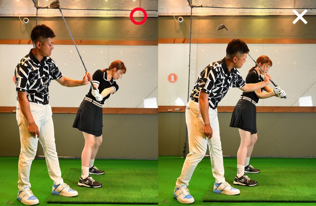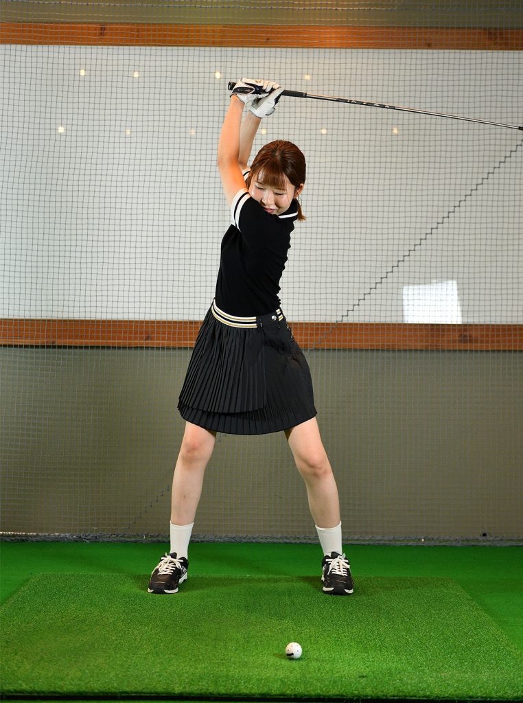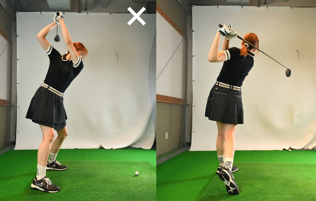手を高く上げると、いち早くボールに向かってクラブを下ろそうとして手が前に出やすい。コンパクトトップなら自然に手を真下に下げられる