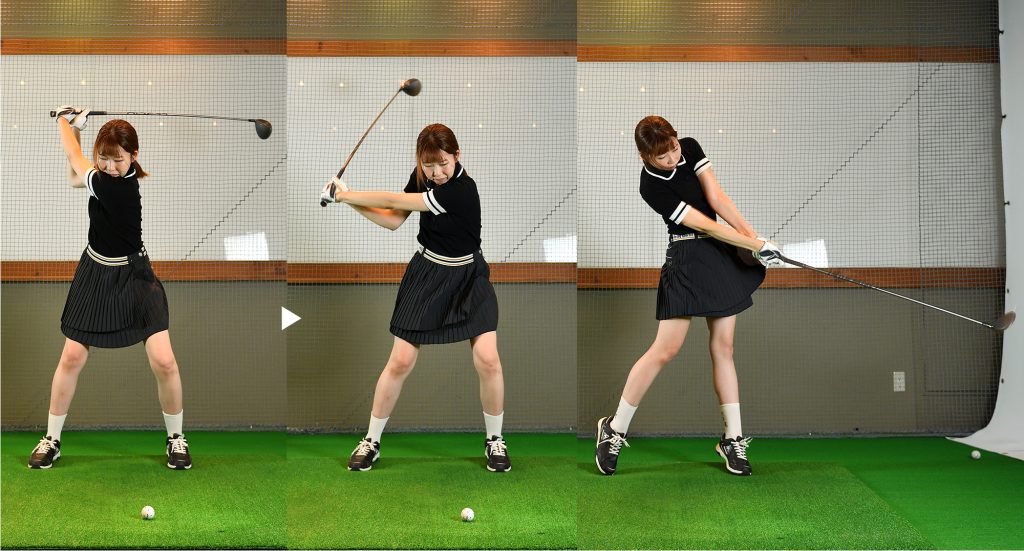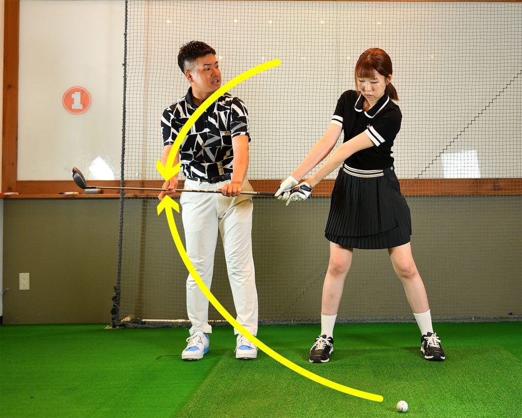 テークバックでクラブが地面と平行になる地点を、ダウンスウィングでも通過させるイメージを持つと、大きな円弧を保ちやすい